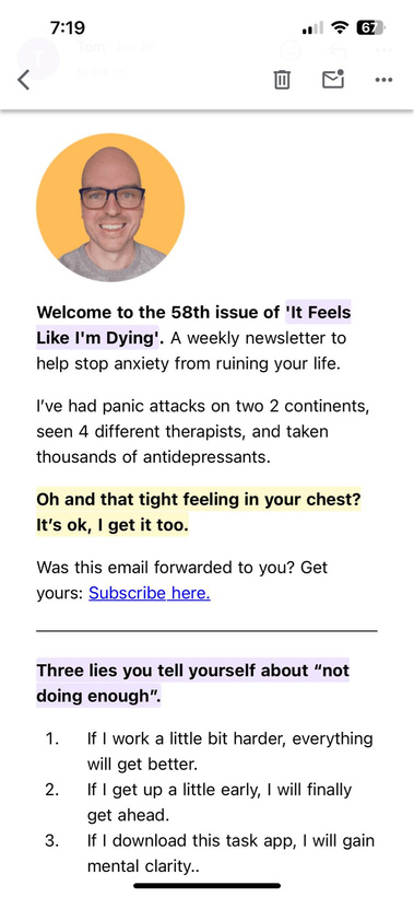 “I get what seems like 100 emails a day and this one is the perfect mix of humour and helping me with my own anxiety and mental health issues.”